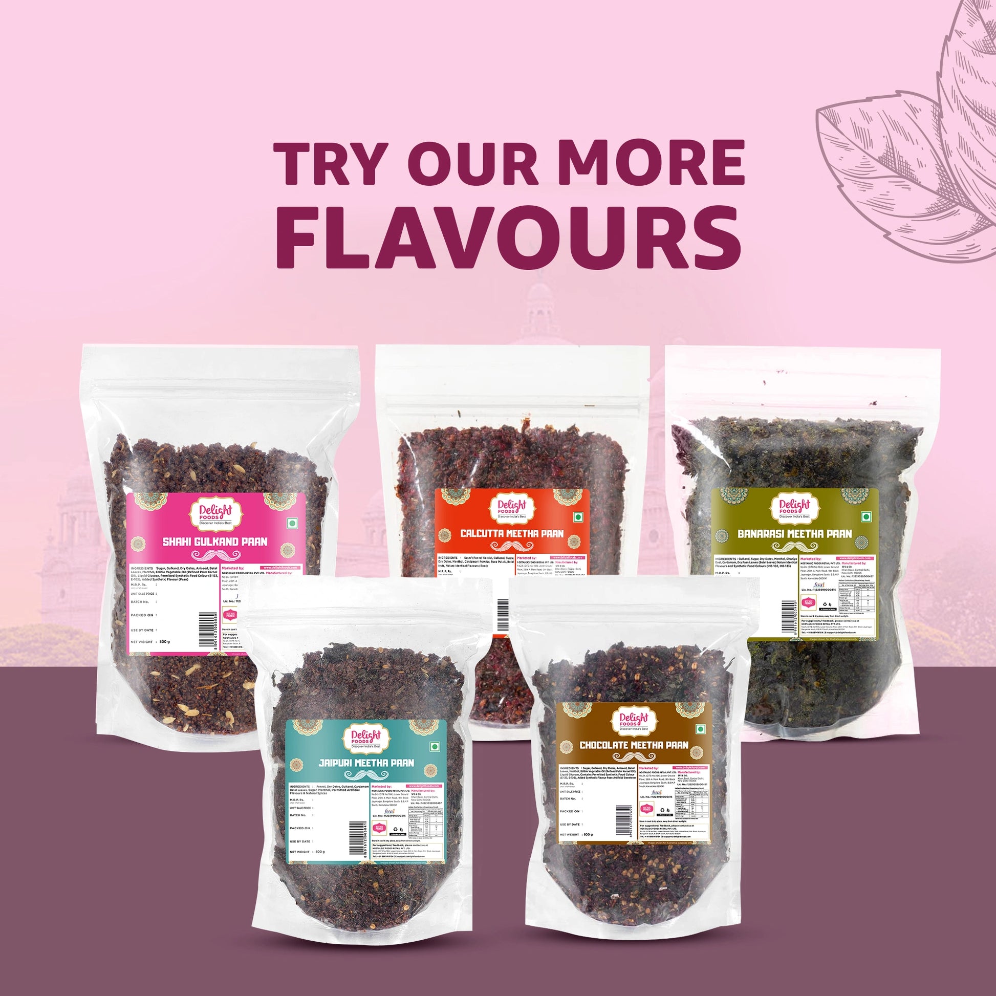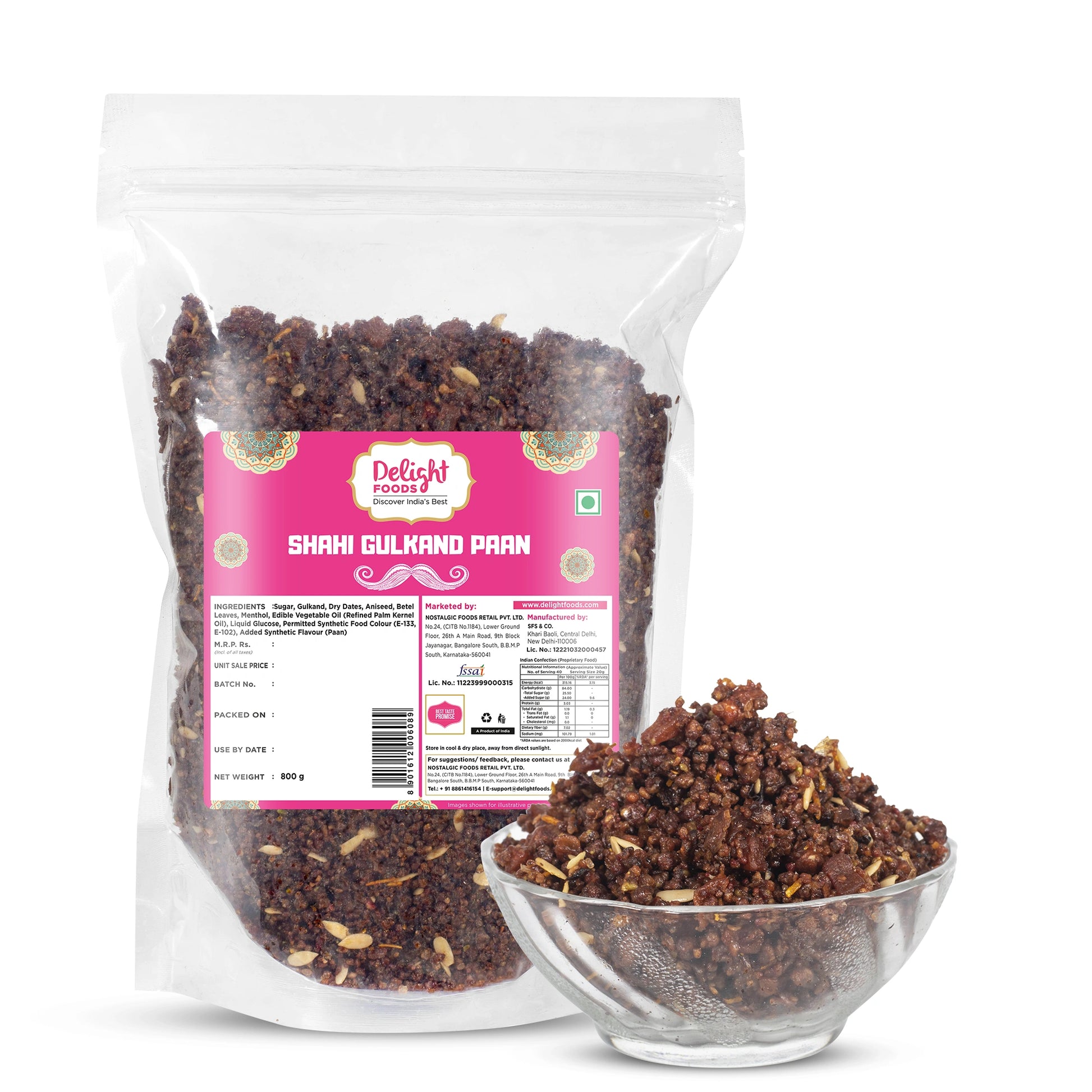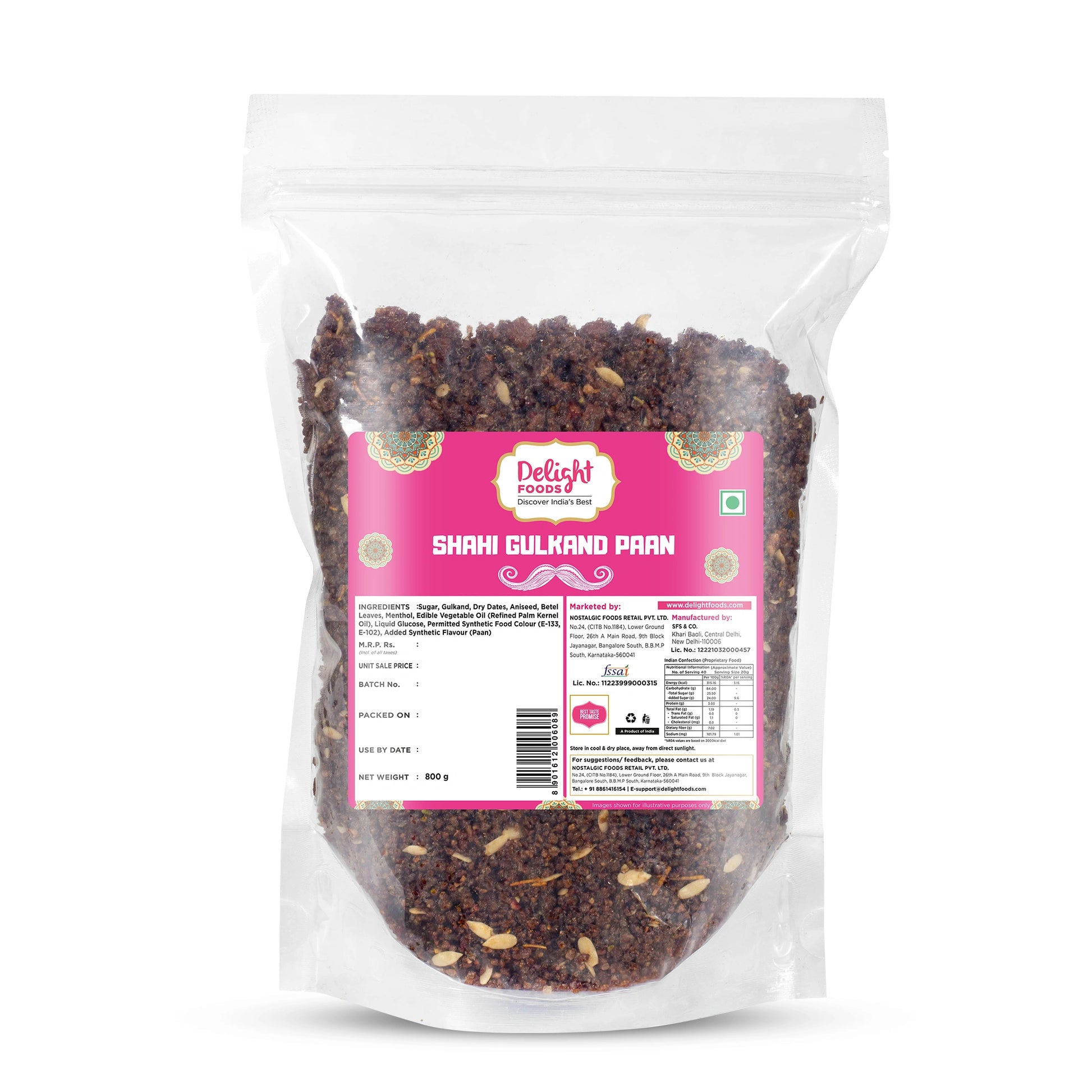 Description - Delight Foods Premium Shahi Gulkand Paan brings you the richness of Indian tradition in a sweet and refreshing way. Made without supari, this rich meetha paan features a delicious blend of pure ingredients . Perfect as an after-meal mouth freshener, just pure sweetness and freshness in every bite.