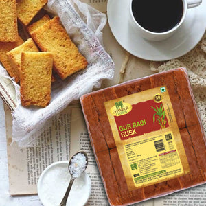 Description -Our Gur Ragi Rusk is a wholesome Indian treat that celebrates the rich heritage of traditional desi snacking. Crafted from nutrient-rich ragi flour and sweetened with pure gur (jaggery), this delightful rusk is freshly baked to golden perfection. Each crunchy slice offers the earthy taste of ragi and the comforting sweetness of gur—a combination cherished in Indian kitchens for generations. Handmade using age-old traditional methods blended with modern baking techniques, it captures the authentic essence of India in every bite. Whether paired with chai, coffee, or warm milk, this desi favorite is a nourishing snack for both kids and grown-ups.